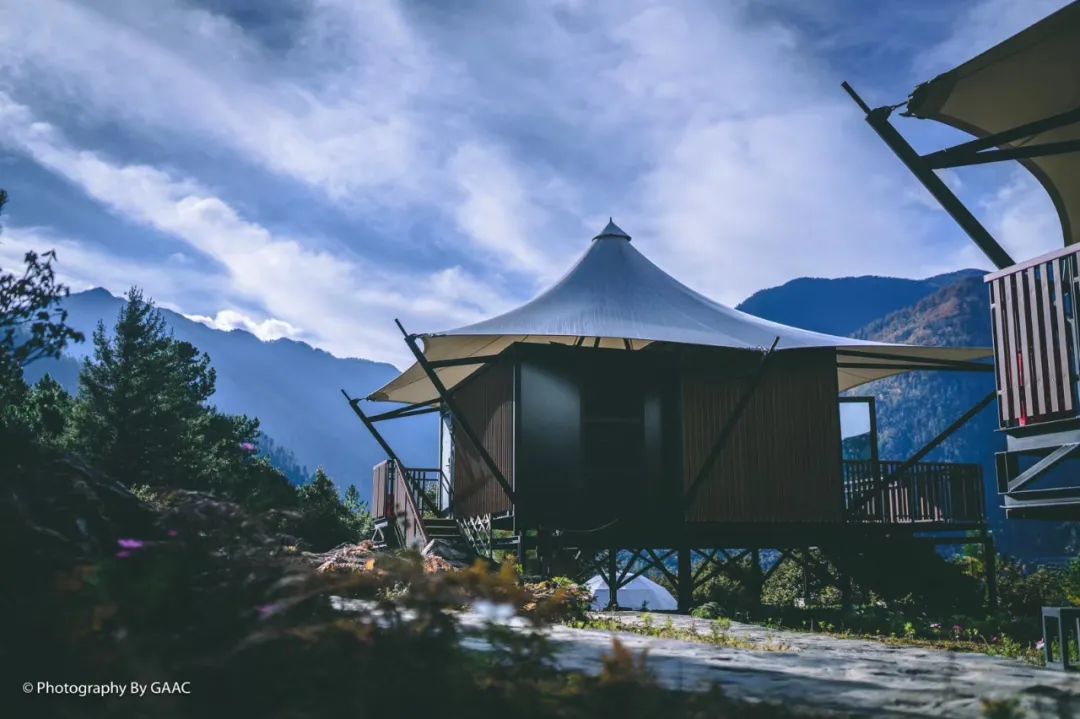 3.保护生态,因地制宜。华侨城牢固树立和践行“绿水青山就是金山银山”的发展理念,始终强调保护自然环境,秉承低碳绿色、生态环保的原则,坚持走保护和开发并重、生态与经济双赢的发展道路,坚持绿色发展、生态发展、因地制宜、精准发力。林芝由于区位特殊,植被单纯、生态环境脆弱,再加上高原的气候环境特殊,植被一旦破坏将极难恢复。汽车营地在规划设计和建设的过程中,始终秉持着保护环境和生态建设的理念,实施生态型开发,采用因地制宜、依山就势的方式,尽可能保留原有地块上大面积的松树、青冈树及原生态灌木,减少对当地植被的影响;并且结合景观、产品、流线,利用现有的地形和植被设计安装装配式建筑,把对环境的影响降低到最小,使人文设施与自然景观实现完美融合。