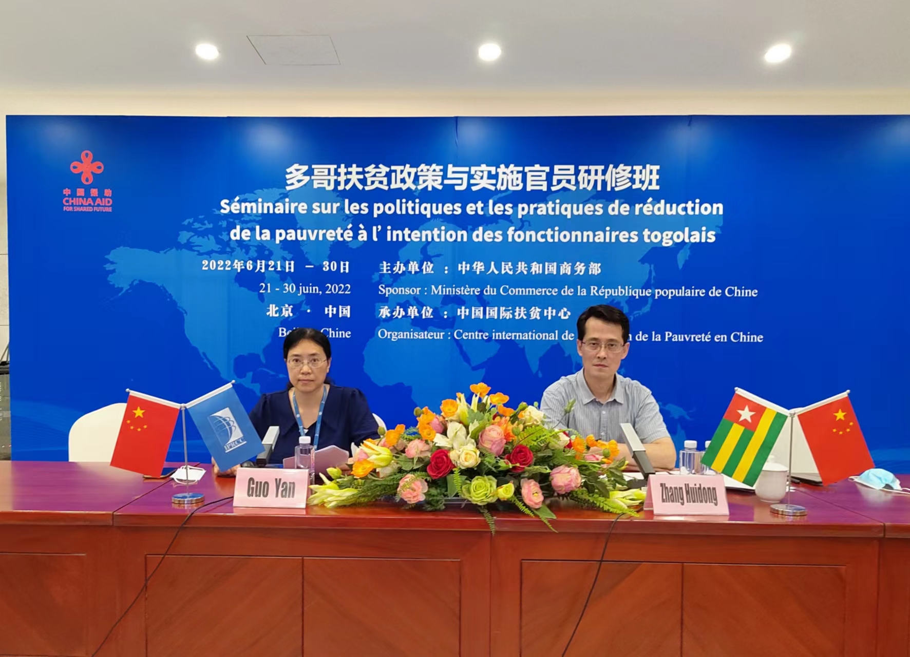2022年6月30日,由商务部主办、中国国际扶贫中心承办的“多哥扶贫政策与实施官员研修班”在北京结业。中国国际扶贫中心副主任张慧东出席结业式并致辞。多哥领土发展部区域规划和发展局区域研究协调科科长雅沃维·埃多·多库农(Yawovi Edo DOKOUNON)先生、弱势群体支持计划通讯和采购助理特巴雷马·塔拉咖(Tébaréma Dissirama TALAGA)女士代表参加研修的学员先后致辞。本次研修班通过专题讲座、视频云参观考察和国别演讲等环节,分享了中国的减贫经验,促进了中多两国在减贫和农村发展领域的交流与合作。学员科西·欧格伯讷(Kossi OGBONE)表示,此次研修班展现了中国脱贫攻坚的伟大成果,希望扩大中国与多哥的合作领域,此外还有学员表示希望来中国进行实地学习与考察。