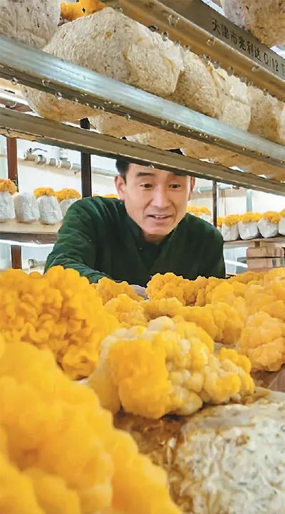 山东省聊城市茌平区胡屯镇充分利用村庄闲置资源、空闲宅基地发展金耳等特色产业,拓宽群众增收致富渠道。图为该镇胡屯新村村民在查看金耳长势。马红坤摄(人民图片)