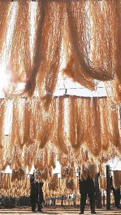 山西省新绛县古交镇南苏村一家粉条专业合作社,社员在晾晒纯手工粉条。粉条加工已成为当地加速乡村振兴的特色品牌产业。高新生摄(人民图片)