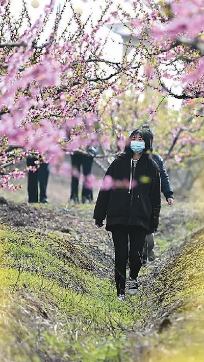 安徽省肥东县响导乡将桃产业与旅游产业相融合,以花为媒带动乡村民宿、农家乐等产业发展,助力乡村振兴。图为游客在响导乡的桃园内游玩。新华社记者 黄博涵摄