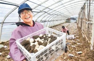 河南省洛阳市孟津区平乐镇象庄村,农户在羊肚菌种植基地一处大棚内展示采摘的羊肚菌。平乐镇依托当地适宜的土壤条件和独特的气候优势,发展羊肚菌特色产业种植,培训农户掌握种植技术,形成羊肚菌原料供应、灭菌、育种、种植、烘干等产业链,带动农户增收致富。黄政伟摄(人民视觉)