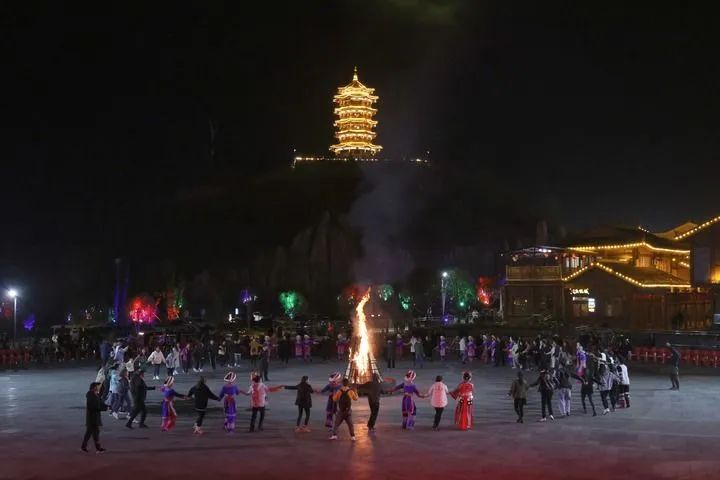 夜幕降临,距离“二十四道拐”不远的阿妹戚托小镇灯火璀璨。文安梅正领着身着民族盛装的彝族妇女在广场上围着篝火跳着彝族原生态舞蹈——阿妹戚托。