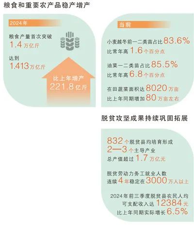 “过渡期以来,经过各方面共同努力,脱贫攻坚成果持续巩固拓展,没有发生规模性返贫致贫。”农业农村部副部长张兴旺介绍,主要有四方面成效:底线更牢。截至2024年11月底,全国累计帮扶534万名防止返贫致贫监测对象稳定消除风险。产业更强。832个脱贫县均培育形成2—3个主导产业,总产值超过1.7万亿元,近3/4的脱贫人口与新型农业经营主体建立了利益联结机制。就业更稳。截至2024年底,脱贫劳动力务工就业人数3305万,已连续4年稳定在3000万人以上。收入更多。据国家统计局数据,2024年前三季度,脱贫县农民人均可支配收入12384元,比上年同期实际增长6.5%。