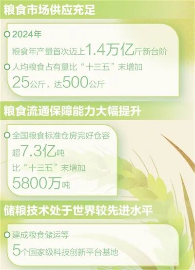 “十四五”时期,我国粮食市场供应充足、运行总体平稳。5年来,全国粮食年产量稳定在1.3万亿斤以上,2024年首次迈上1.4万亿斤新台阶,人均粮食占有量比“十三五”末增加25公斤,达到500公斤,高于国际公认的人均400公斤粮食安全线,做到谷物基本自给、口粮绝对安全。多措并举畅通农民售粮渠道,持续优化为农为企服务,年均粮食收购量在4亿吨以上。