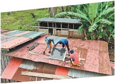 科洛尼亚村地处海边,被称为“海岸村”。村里的高脚木屋形制简单,底层大多堆放农具杂物,上层以木板为墙、铁皮为顶。屋顶新架起的太阳能板,在阳光下反射出耀眼的光,成为村里最鲜明的现代印记。