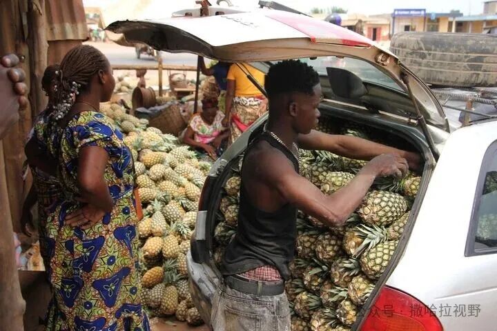 3月16日,在贝宁“甜面包”菠萝主产区泽镇,农民将菠萝装车。