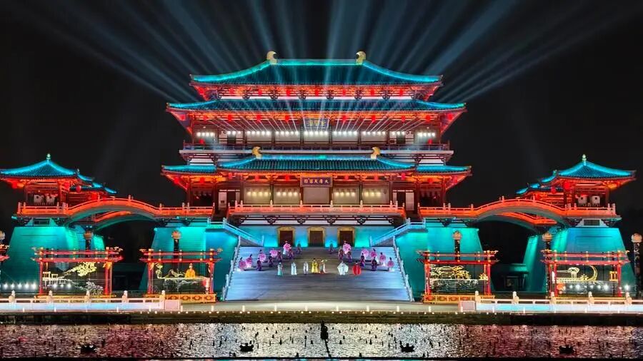 天色渐晚,创新的舞台升向夜空。清明假期,西安大唐芙蓉园300亩湖面上,20米水幕再次升起,裸眼3D投影点亮紫云楼。大型沉浸式水舞光影秀《大唐追梦》焕新上演,游客登上仿唐画舫,在《将进酒》的吟诵中穿越盛唐诗篇。