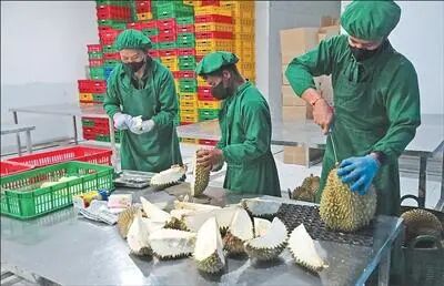 为拓宽国际市场,印尼各级政府加强榴莲产品质量监管与产业配套建设,要求出口榴莲原料来自获得全球良好农业操作认证的果园,符合食品安全、植物检疫等国际标准,并推动建设体现国际规范的包装厂和冷链物流设施。在阿玉的榴莲园,榴莲采摘后会被运往约两公里外的加工厂。“在工人按等级逐一筛选后,榴莲还要经历一系列严格流程,包括清洗、剥壳、分级、快速冷冻和包装,最后贴上出口标签,装入冷链集装箱运往港口。”阿玉说,为开拓海外市场,工厂在2023年投资购置了风冷式冷冻设备和冷藏设施,通过严格的质量控制、卫生管理和快速冷冻技术,尽量保留榴莲原有的风味和口感。