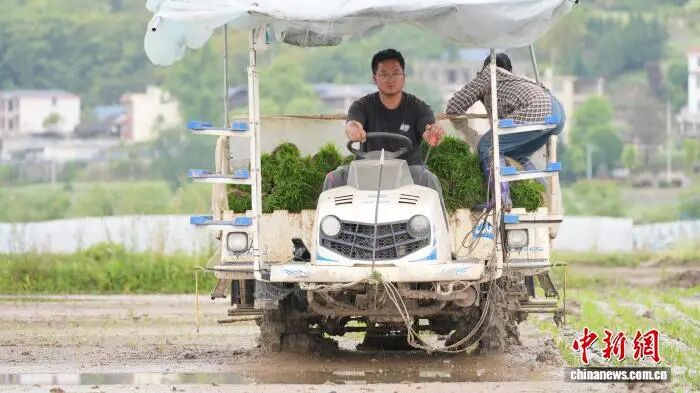 时下,在贵州省铜仁市思南县塘头镇关中坝水稻种植基地里,“90后”新农人黎青春正驾驶插秧机在田间来回穿梭。所过之处,嫩绿的秧苗整齐排列,十几分钟就完成了一亩田的插秧作业。