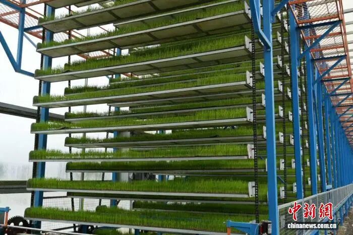 几公里外,占地500多平方米的智能化育秧工厂里,立体循环育秧架上齿轮缓缓转动,一盘盘秧苗像“坐电梯”一样上下往复,均匀接受光照和水肥。两条生产线一次可育3700多盘秧苗,20天左右,秧苗就能下田移栽。